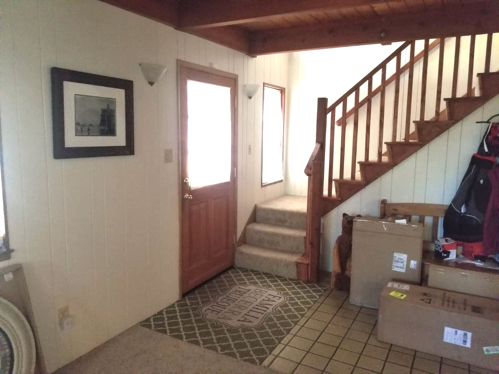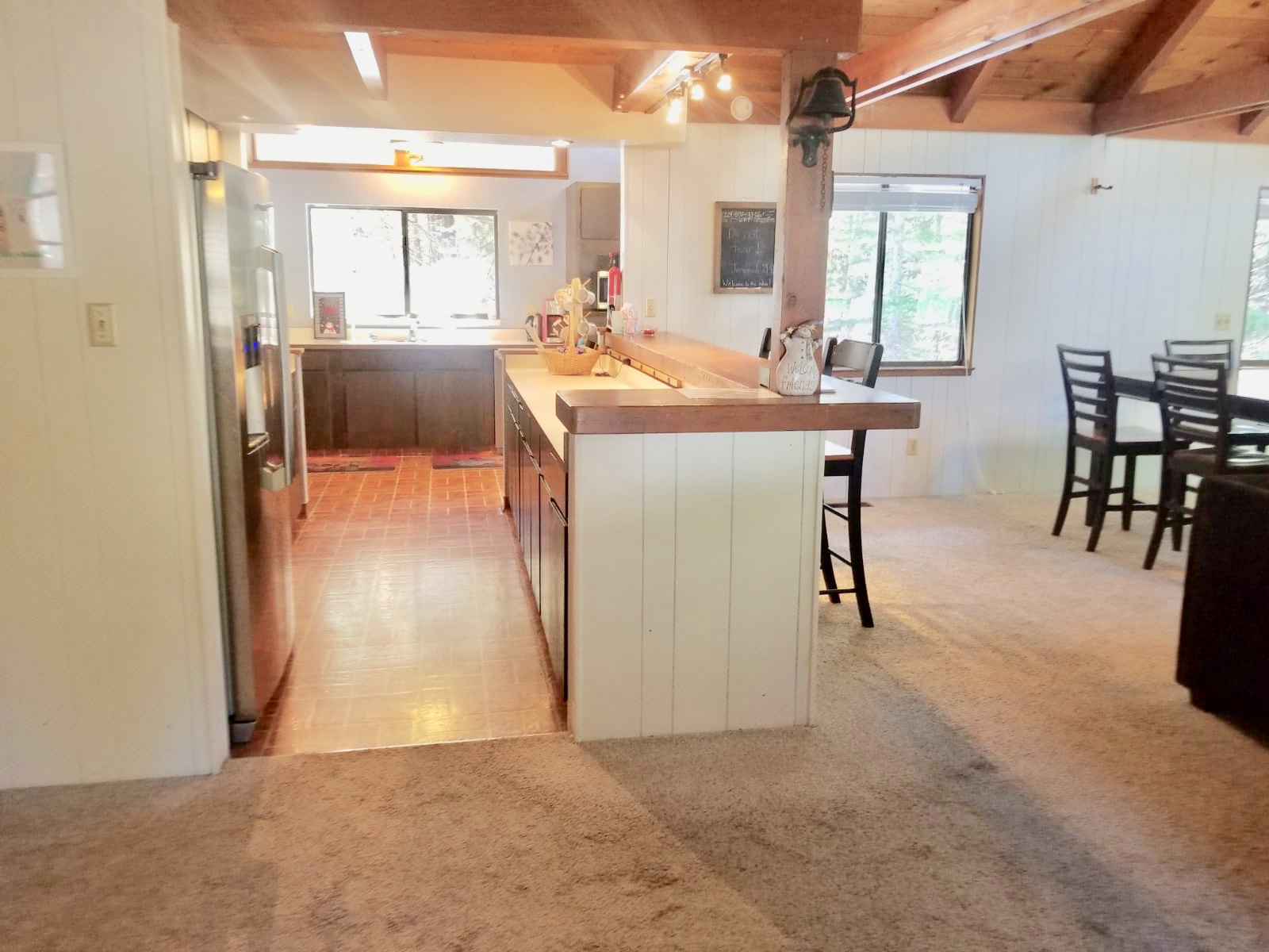 There is a kitchen, living room, and 2 rooms on the upper level and 4 rooms on the lower level.